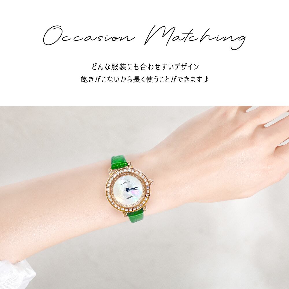 ホワイトとグリーンの2色からお選びいただける、ラメレーザーベルト、ジルコニアCZダイヤモン、白蝶貝文字盤が特徴の、美しくエレガントな腕時計です。